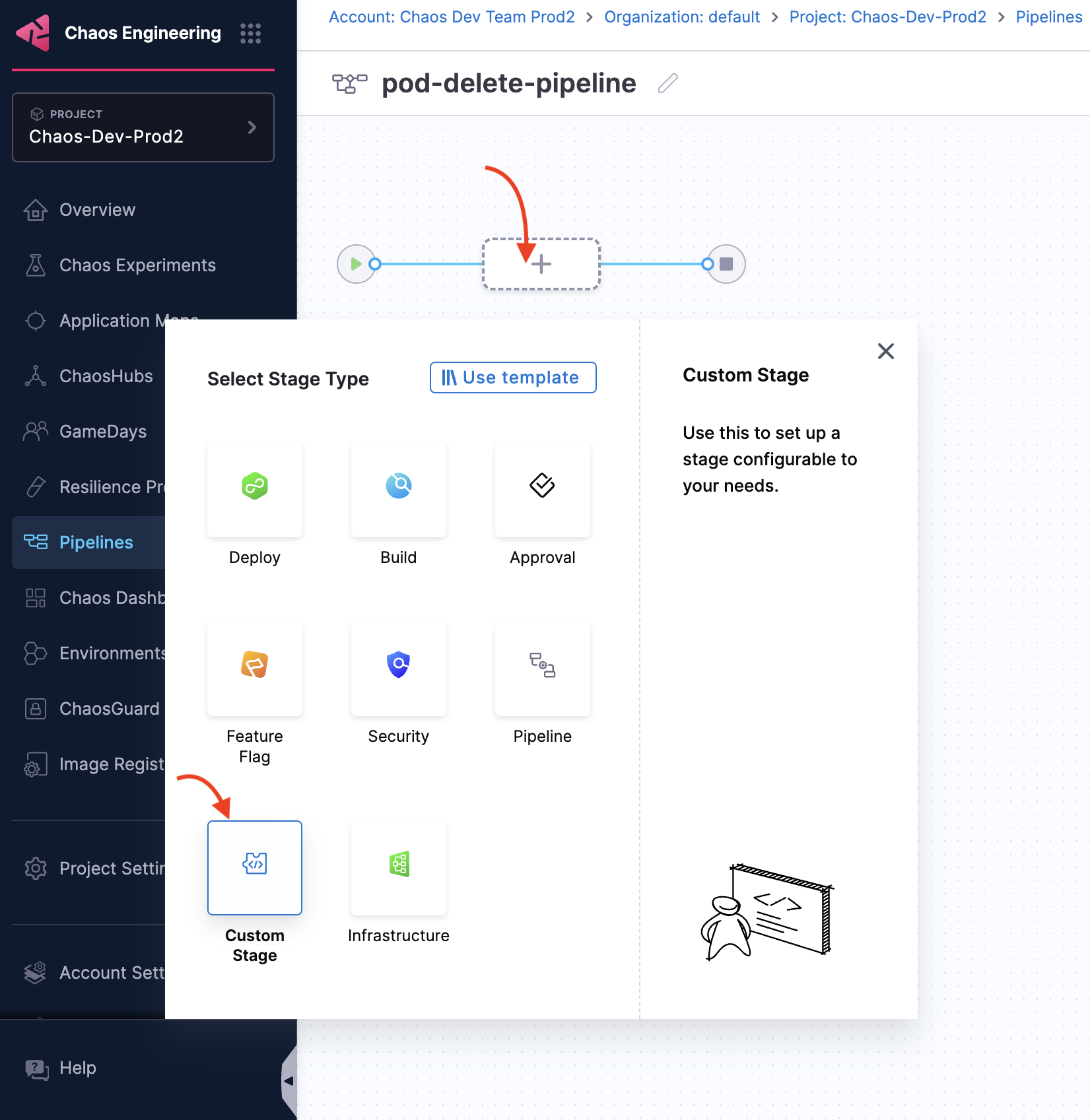 Go to Chaos module and select Pipelines and click +Create a Pipeline.