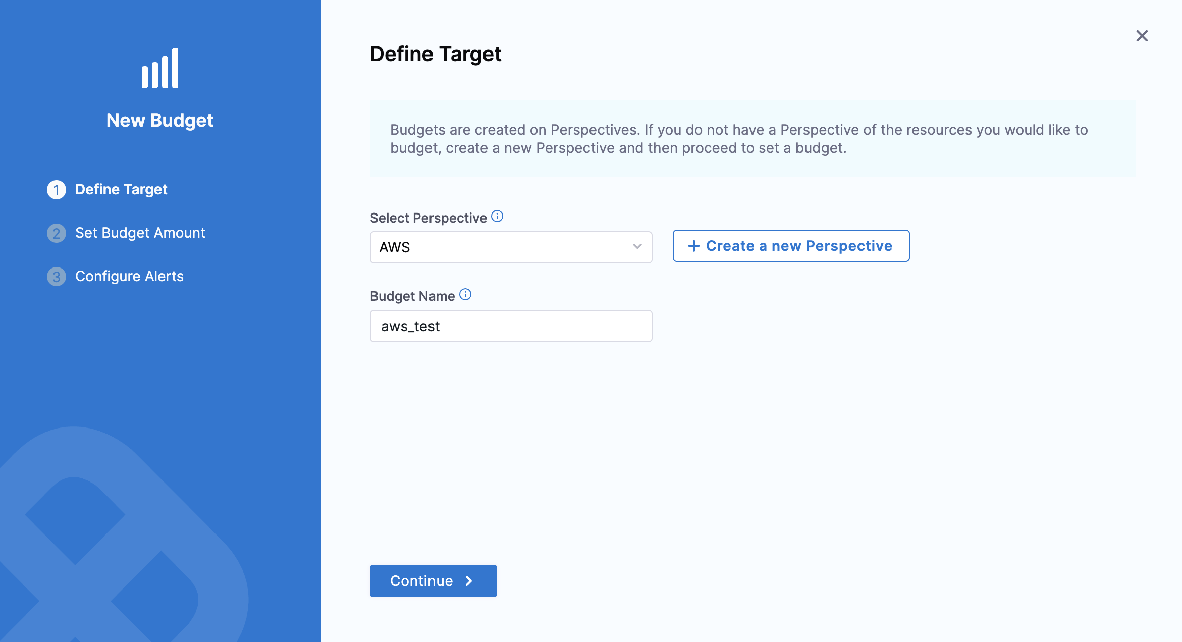 Budgets are created on Perspectives. If you do not have a Perspective of the resources you would like to budget, first create a new Perspective and then proceed to set a budget. You can add multiple budgets for a single Perspective.