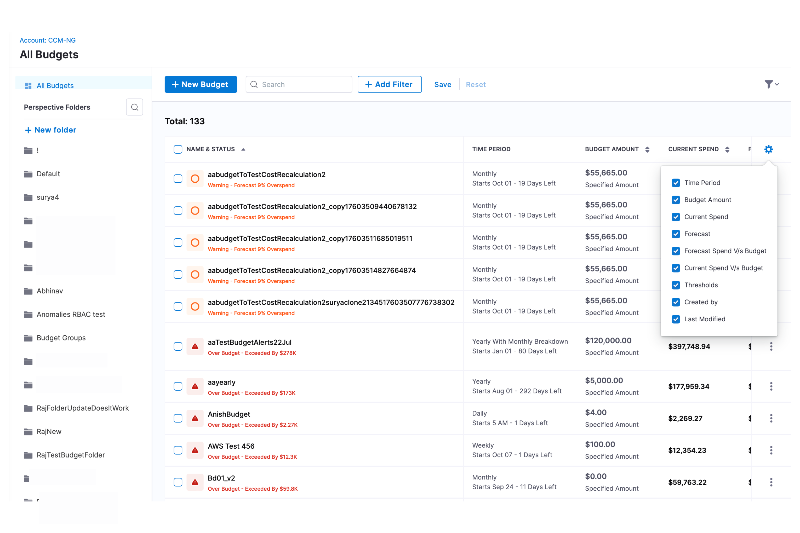 • Customizable View: Configure your columns to display the metrics that matter most: Time Period, Budget Amount, Current Spend, Forecast, Forecast vs. Budget, Current Spend vs. Budget, Thresholds, Created By, Last Modified