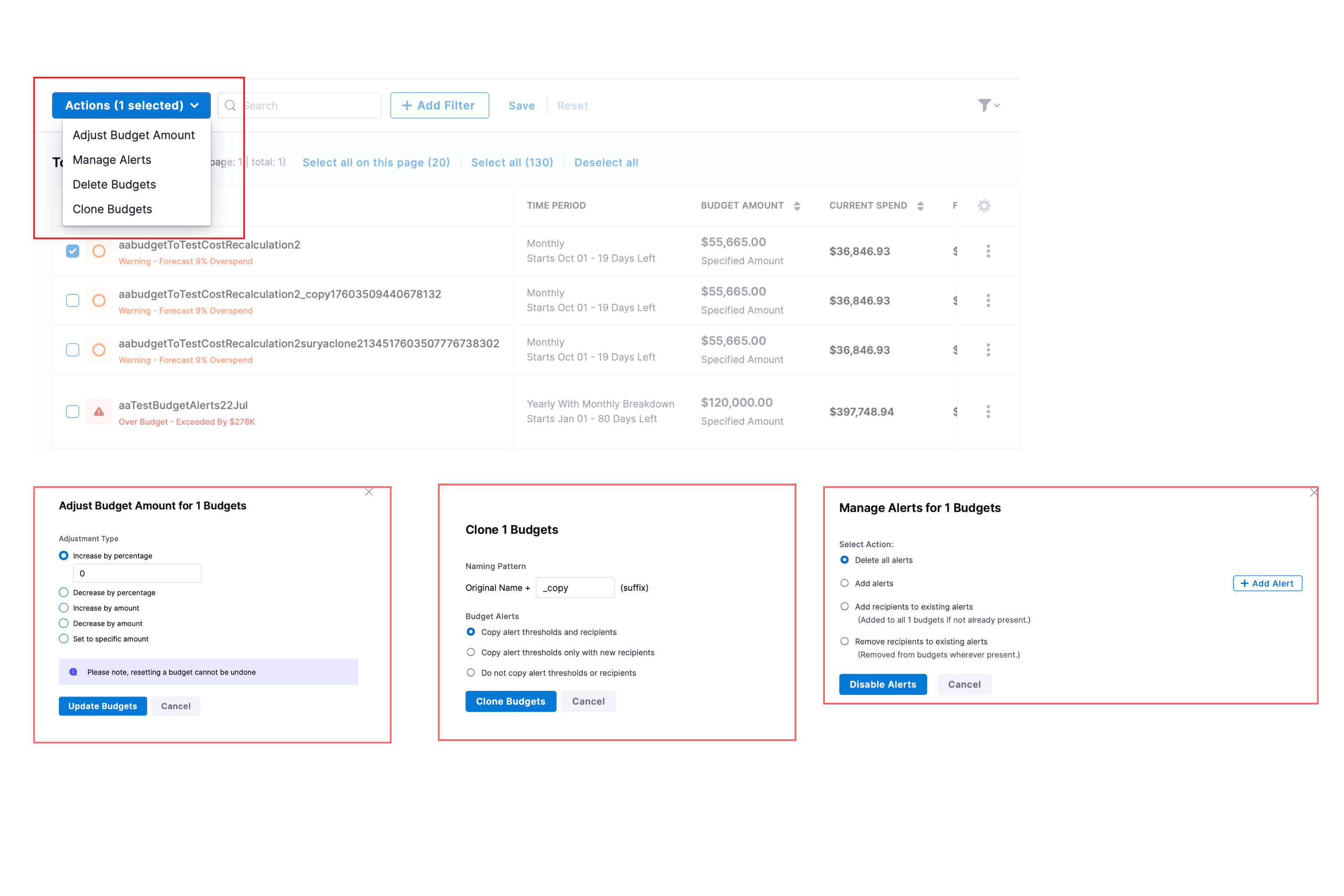 • Clone Budgets: Duplicate selected budgets with options to copy alert thresholds and recipients or customize as needed