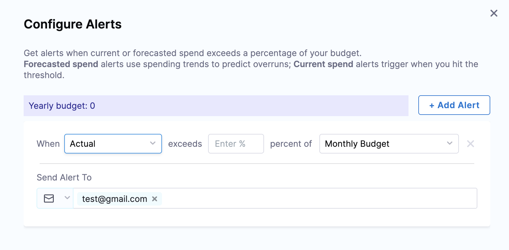 Harness will send an alert to the specified email addresses and Harness User Groups when the actual or forecasted cost exceeds a percentage of your monthly budget