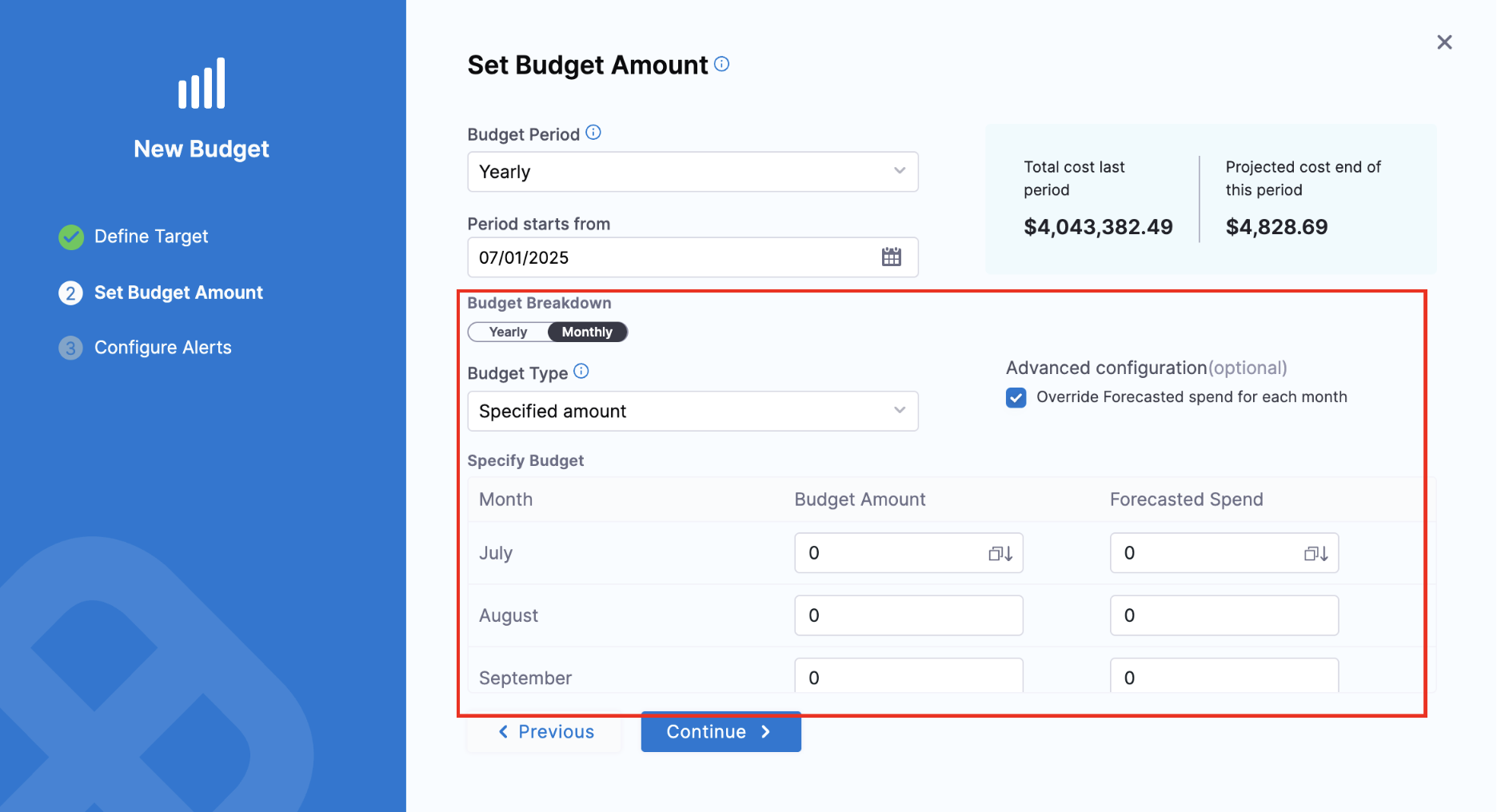 • Monthly: Individual budget amounts for each month of the year, with the option to override forecasted spend for each month.