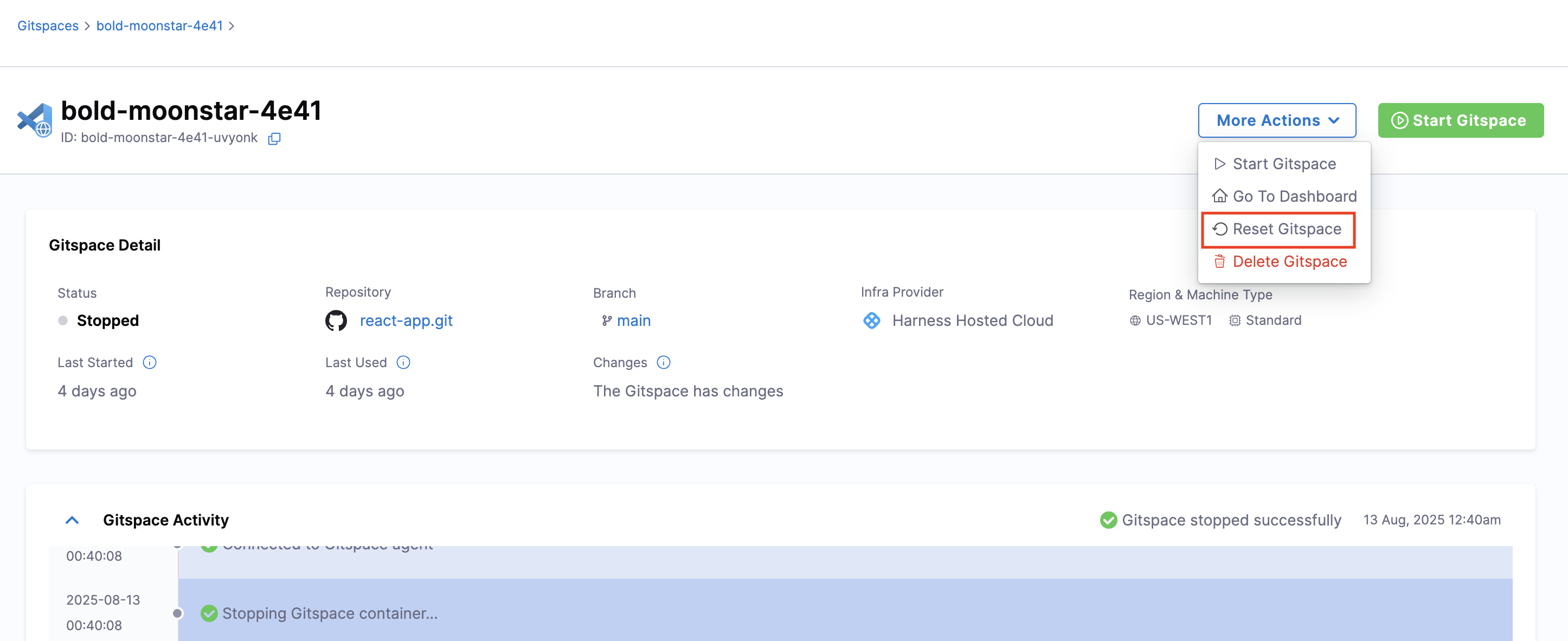 2. Select the Gitspace you want to reset and open the Gitspace Details page.