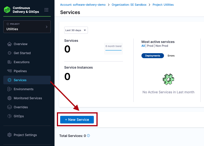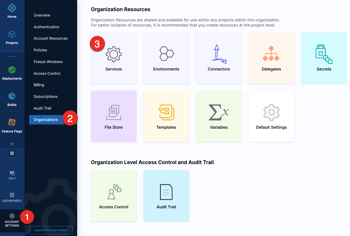 To create a service at an account or organization level, go to Organization Resources >Services.