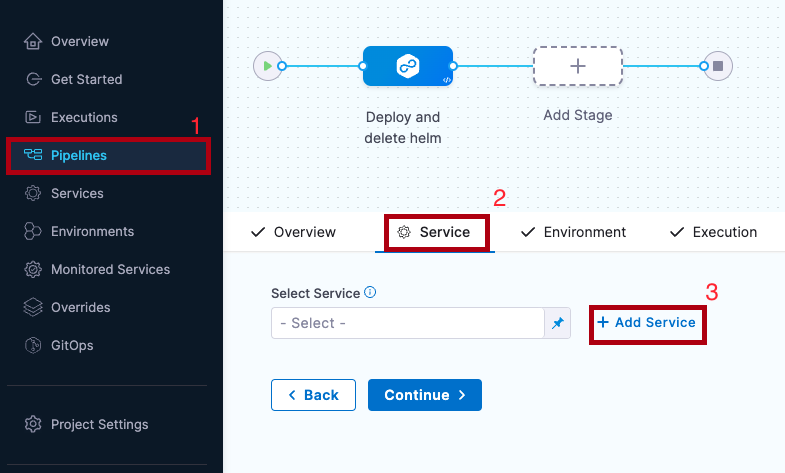 To create a service from inside of a pipeline, select the Services tab of a new CD stage, then select New Service.
