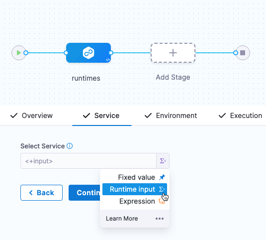 When you run the pipeline, you can select the service and environment for their runtime inputs.
