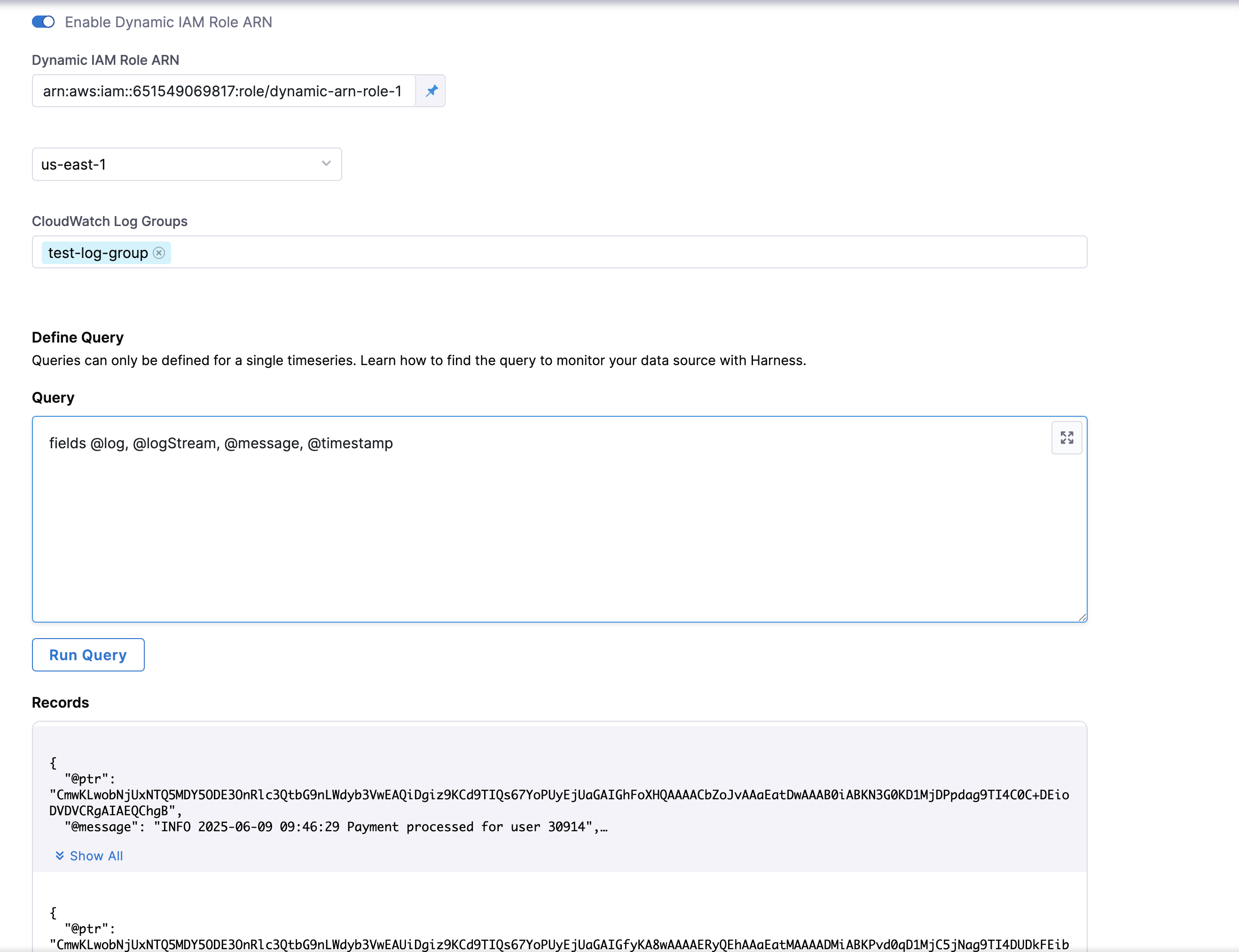 Just enable the Dynamic ARN toggle, enter the dynamic role arn in the new textbox that appears followed by the region and log-group.