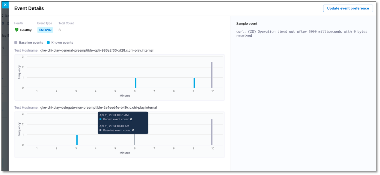 Event health has three possible values: Healthy, Medium Healthy, and Unhealthy. These values are directly associated with the Known, Unexpected frequency, and Unknown event types, respectively, if you have not set any event preferences. However, you have the ability to modify this mapping by setting preferences for a log cluster. For example, marking an "unknown" cluster as non-risky would change its classification to "Healthy." For more information on the event preference setting feature, go to Event preference or log feedback.