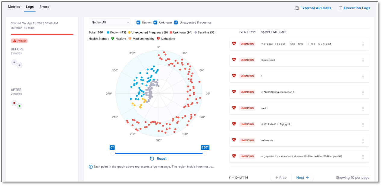 Unexpected frequency: Log clusters that were seen on both Canary or After nodes and Primary or Before nodes, but with increased frequency.