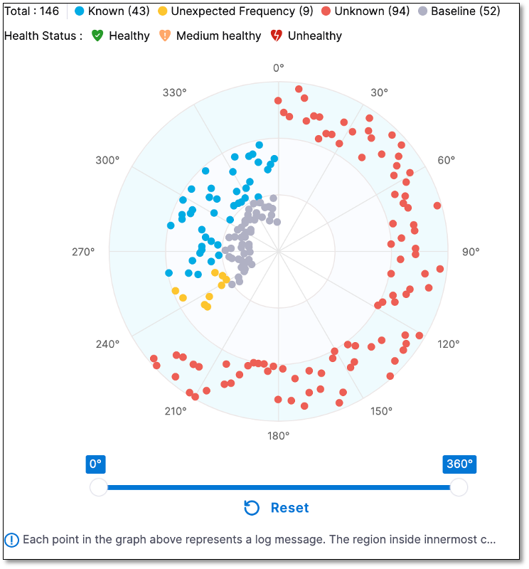 View specific clusters in a specific cluster: A slider located below the chart enables users to zoom in on a specific set of log clusters, allowing for a closer examination and analysis. The Radar Graph is divided into several sectors, with each sector having several log messages. Use the slider to view the log clusters in a specific sector. When you select a sector using the slider, the event list displays the events specific to that sector.