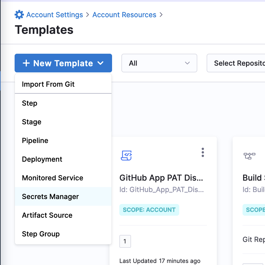 1. Go to your Harness Account Settings and select Templates under Account Resources.
