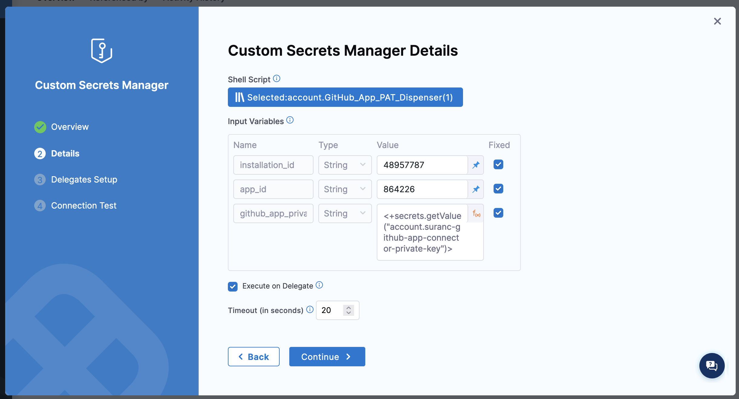 3. For Secrets Manager, select your GitHub App custom secrets manager connector.