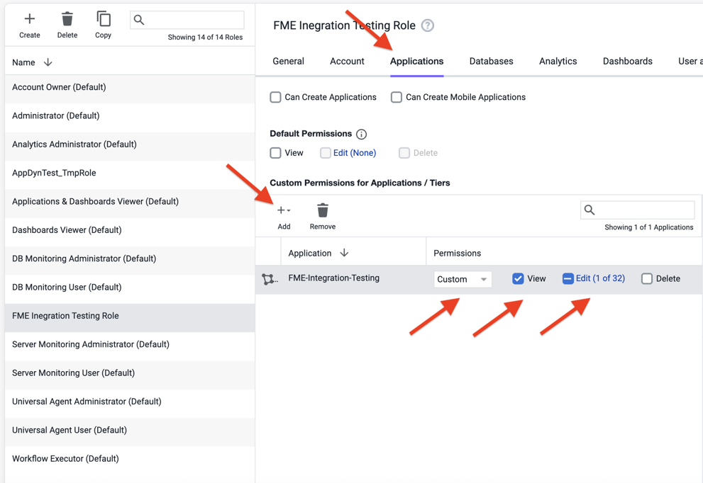 Navigate to the Applications tab and click + Add under Custom Permissions for Applications/Tiers. Select