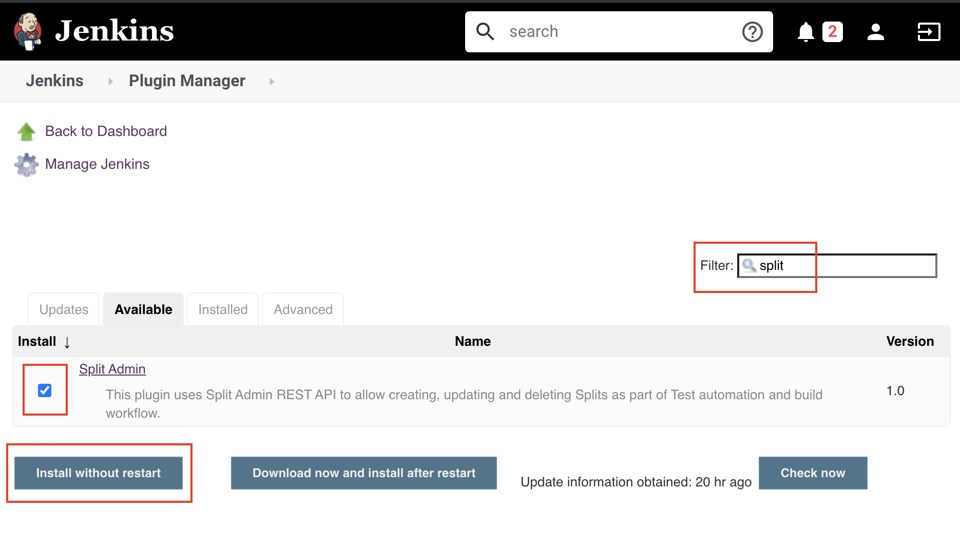 In Jenkins Plugin Manager page, under Available tab, enter Split Admin to find the plugin and install it.