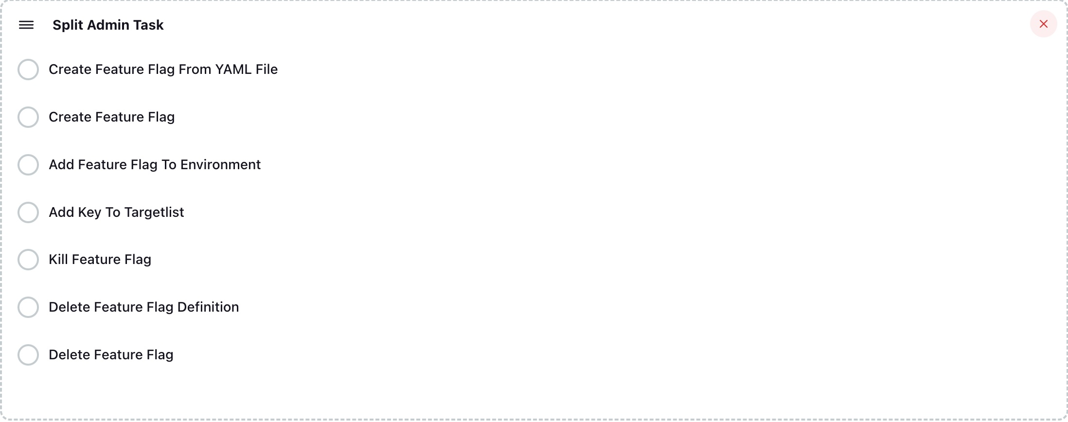 • Add Feature Flag To Environment: This task will add new definitions to an environment of an existing feature flag. The fields below are required. The plugin will check if feature flag definitions exist in the given environment. If it exists, the task is skipped with no errors returned: Project Name Environment Name Split Name Split Definitions. The definitions field should match the JSON structure accepted by Harness FME Admin API, see the API reference for more info.