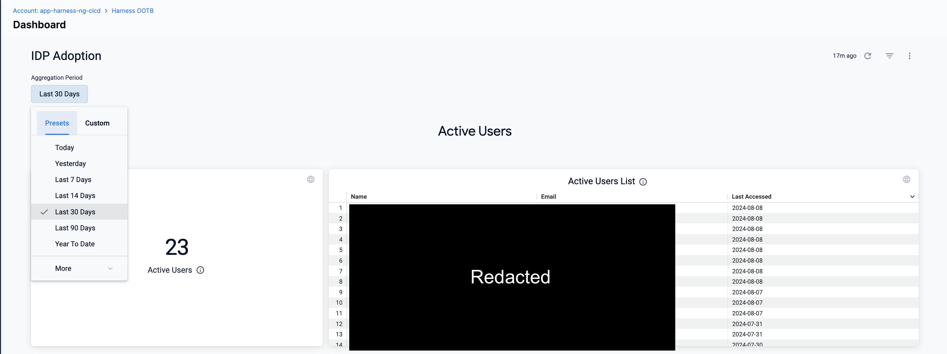 We provide an out-of-the-box adoption dashboard to help you with tracking Harness IDP adoption inside your organization. You can find this Dashboard under Custom Dashboards.