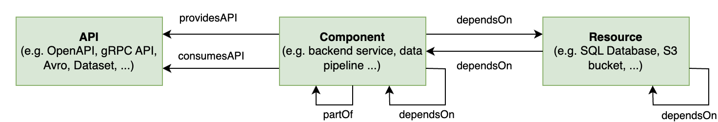 These relations express that a component belongs to a larger component; a component, API or resource belongs to a system; that a system is grouped under a domain; or that a domain belongs to a larger domain.