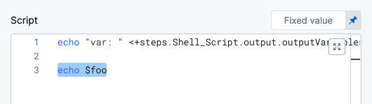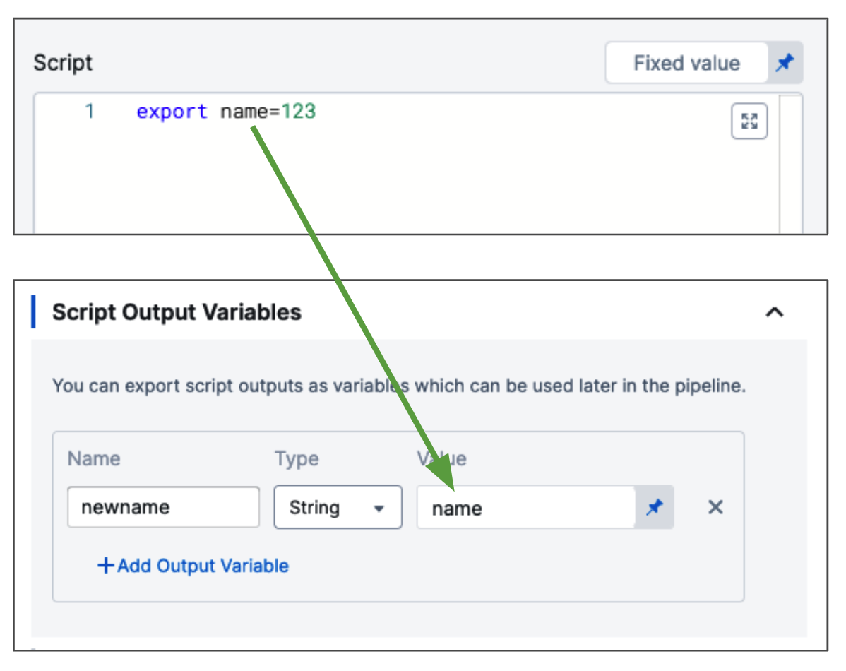 Here's an example showing how the Script Output Variables references the exported variable test, and how you reference the output variable Name var1 in a subsequent Shell Script step to get that value: