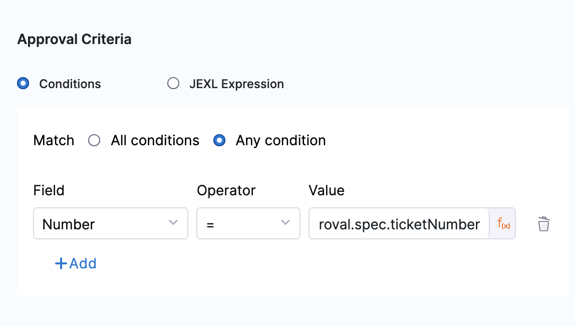 • If the resolved JEXL expression is a Boolean true, the approval criteria is met.
