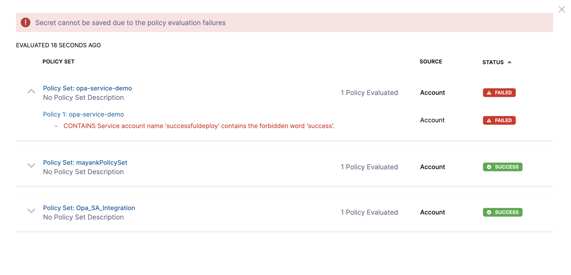 - Warn & continue - You will receive a warning if the policy is not met when the Service Account is evaluated, but the Service Account will be saved and you may proceed.