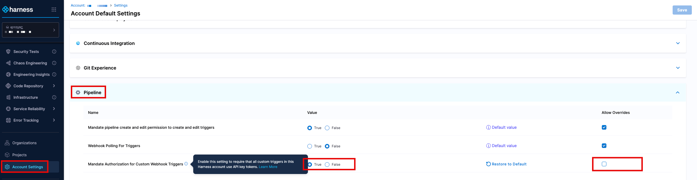 4. When the Allow Overrides box is selected at the account level, Harness users will be able to select a different value for this setting at project level. For example a project, in Default Settings > Pipeline may have a a different value for Mandate Authorization for Custom Webhook Triggers, when compared to the Account or Organization settings. Remove the ability to override this setting to ensure that the authorization is enforced and cannot be adjusted.