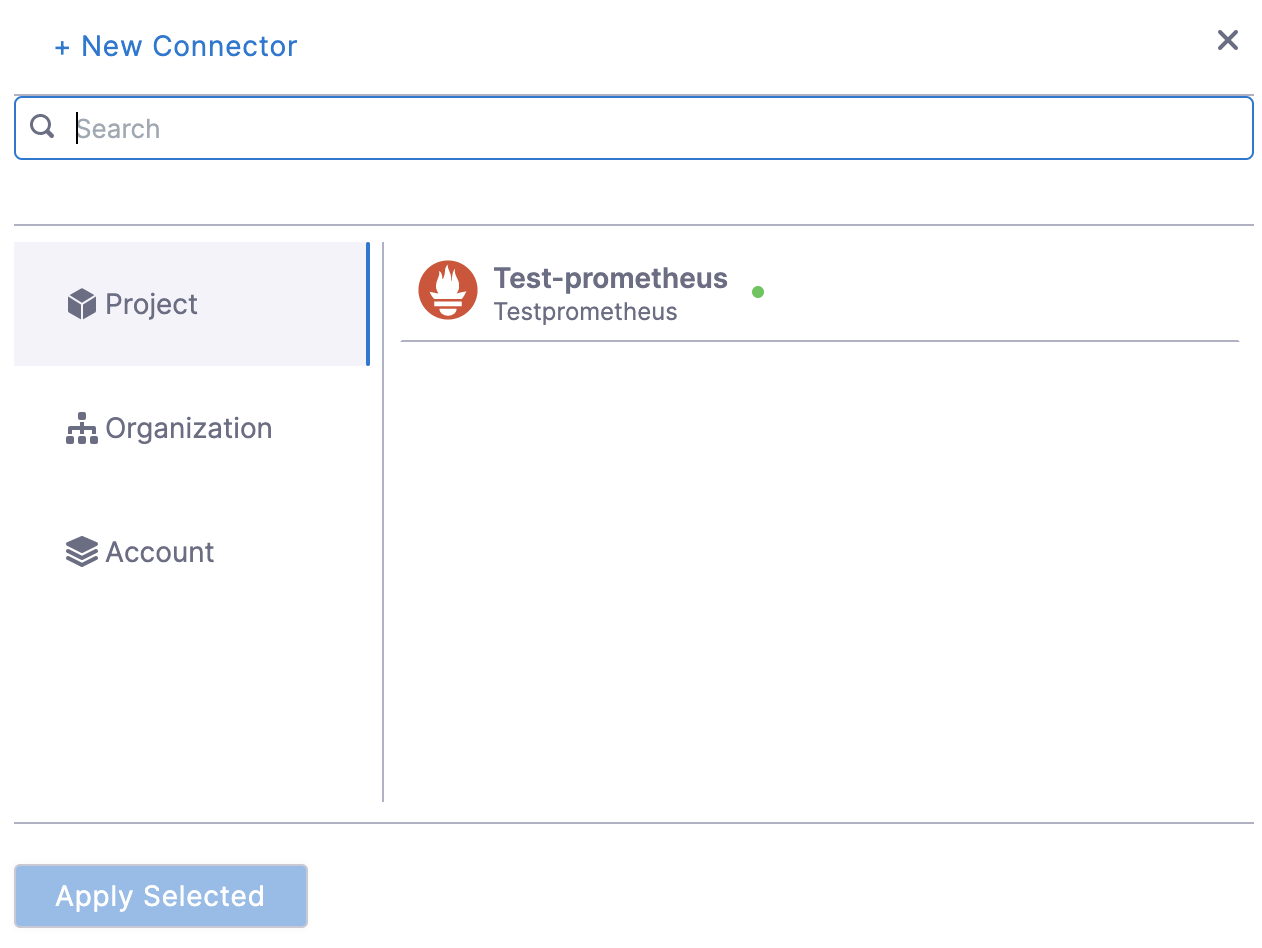 - After selecting the connector, click Apply Selected. The Connector is added to the Health Source.